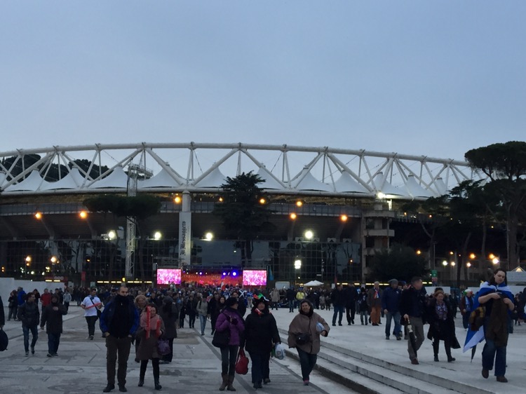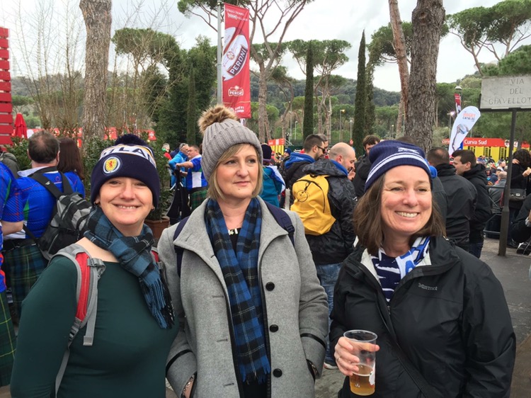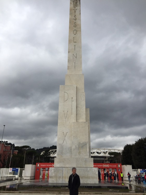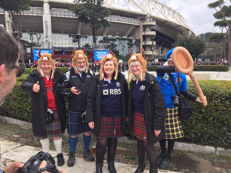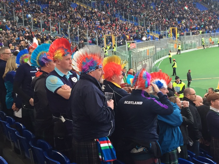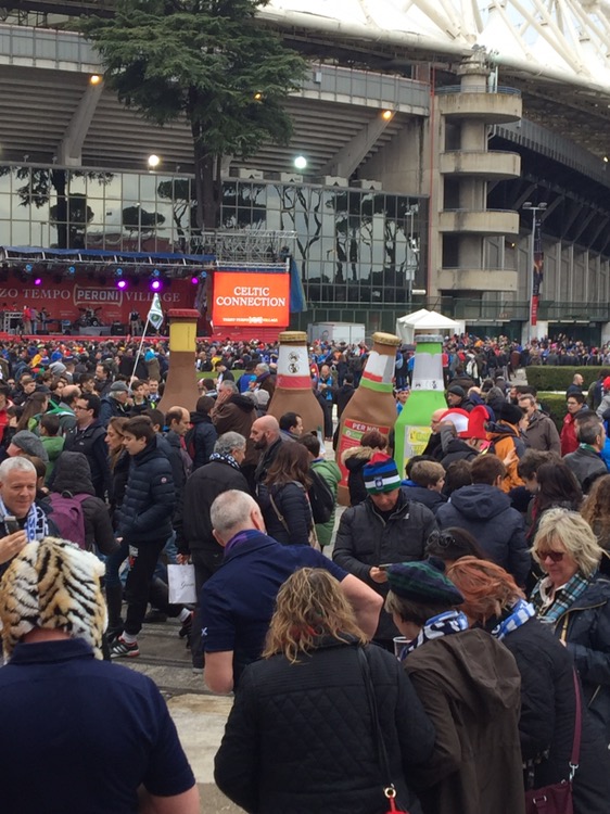 Saturday-game day! The long awaited game of rugby was here. We made our way to the stadia olympico in good time. We met under mussolini’s obelisk. A trip over the Tiber and an uninspiring lunch was consumed. We followed a sea of supporters to the ground and took our seats, after soaking up the atmosphere, the kilts and the good humour of the crowd.