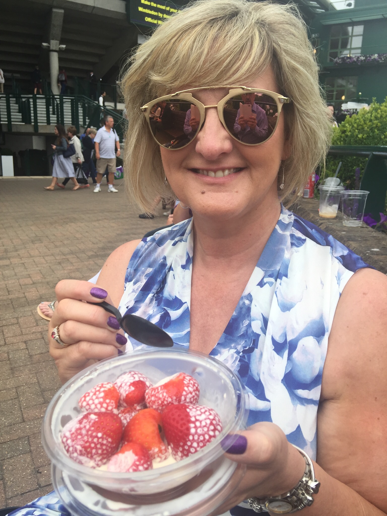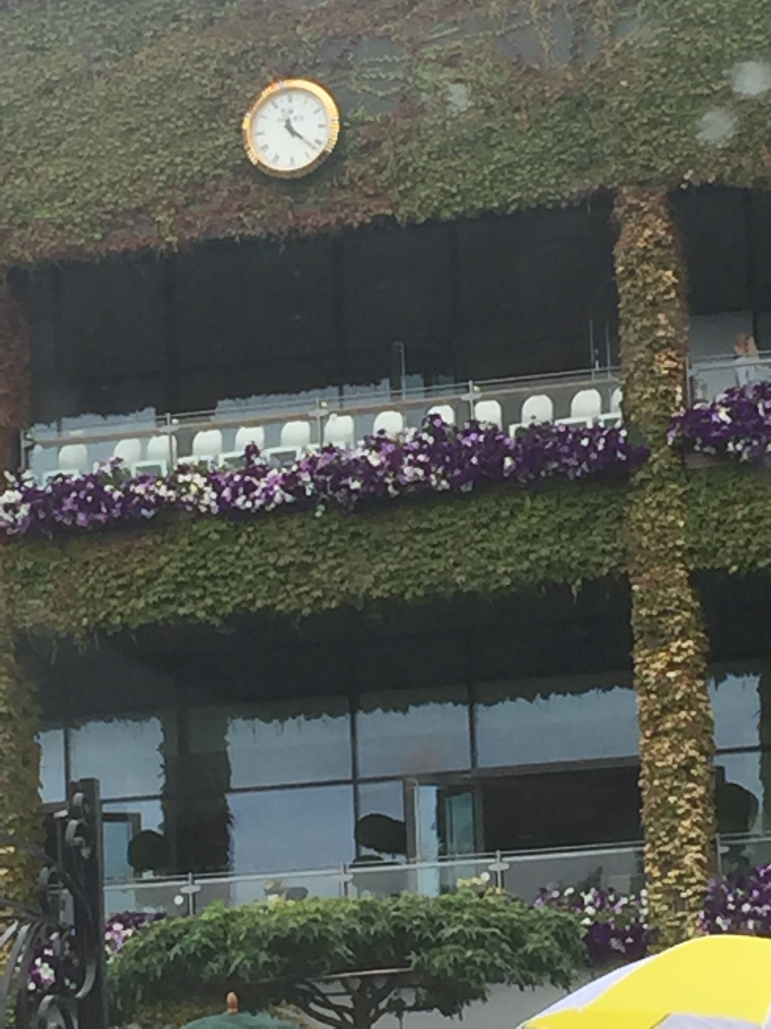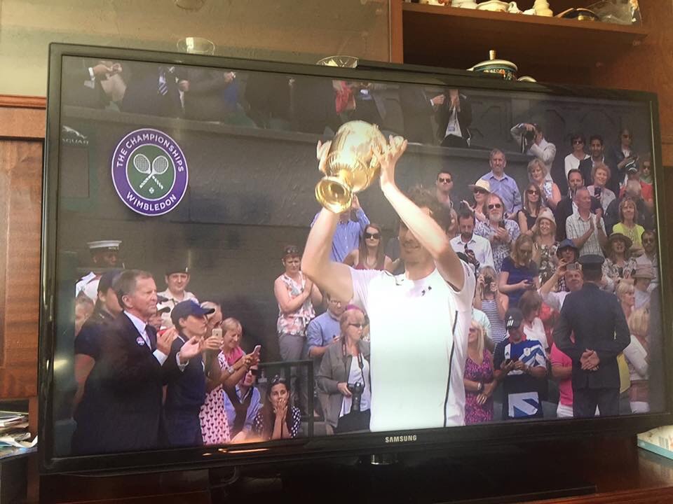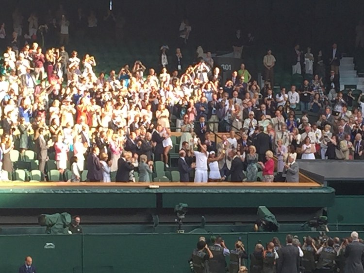 The rain stopped, we saw Boris Becker, Pat Cash, McEnroe, Tim Henman and Leyton Hewitt. Sue Barker came out and interviews began. That’s when my phone started with – where are you, what are you wearing? Then photos sent from screen shots. I had the privilege to sit next to Ruth and her son Richard, both equally excited as we were to be there, their joy unconfined.
