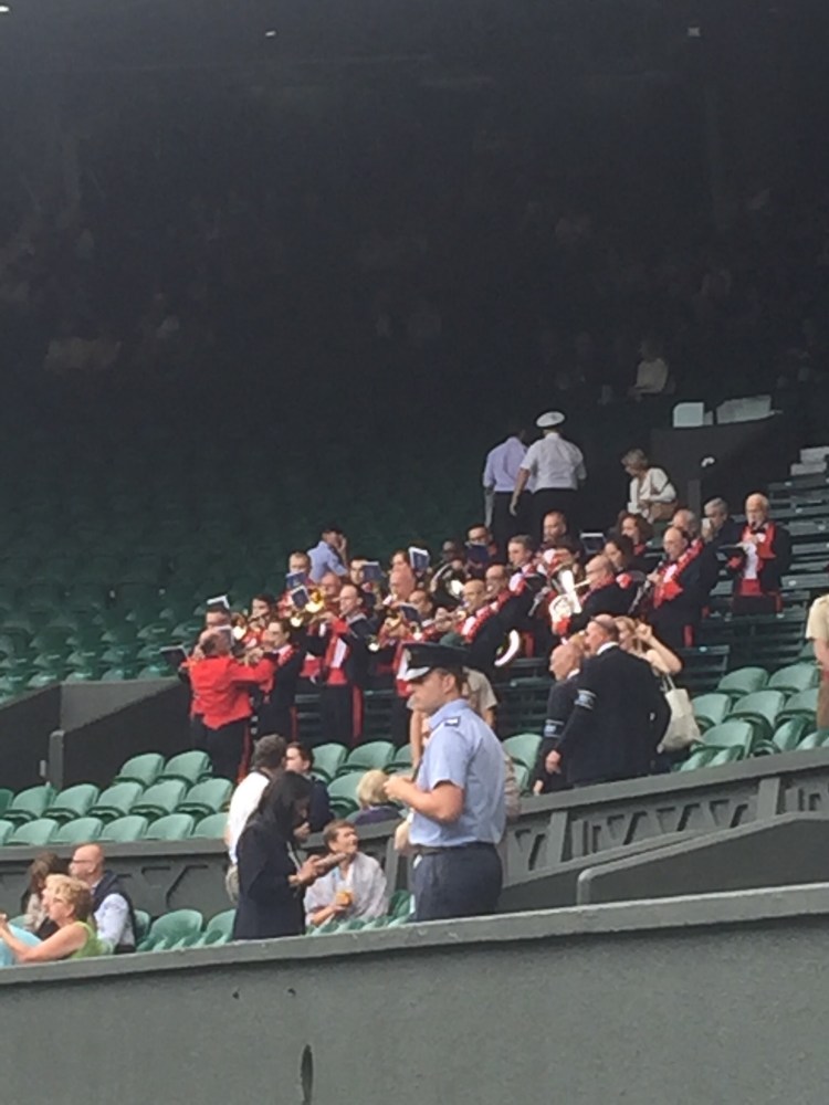 Ok, my heart pounding, we made our way to gangway 111 and found our seats. It struck me how much smaller it was, seems so much bigger on TV. Light rain began to fall and we sheltered under an umbrella, whilst a brass band blasted out some tunes.