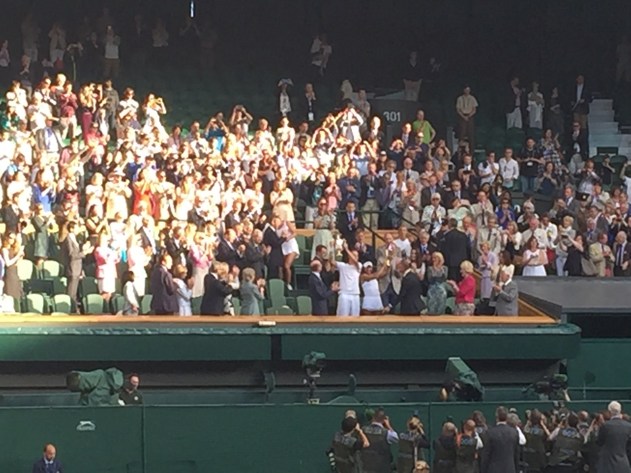 Gosh, doubles are played at a much faster pace, reactions quicker and as the sun faded we were treated to a delightful show. In what seemed a short amount of time, we had another Wimbledon Champion! This time the presentation to be made in the Royal Box.