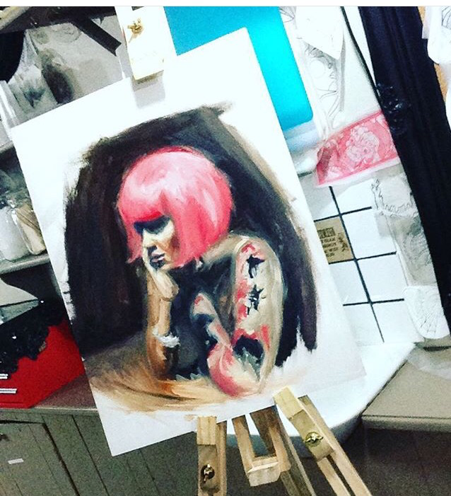 This painting was done by my youngest son, Joe, recently, and I love it! There is an air of mystery shown by the tattooed model. Is she wondering when she will get home, what she has planned for tomorrow or her evening meal?