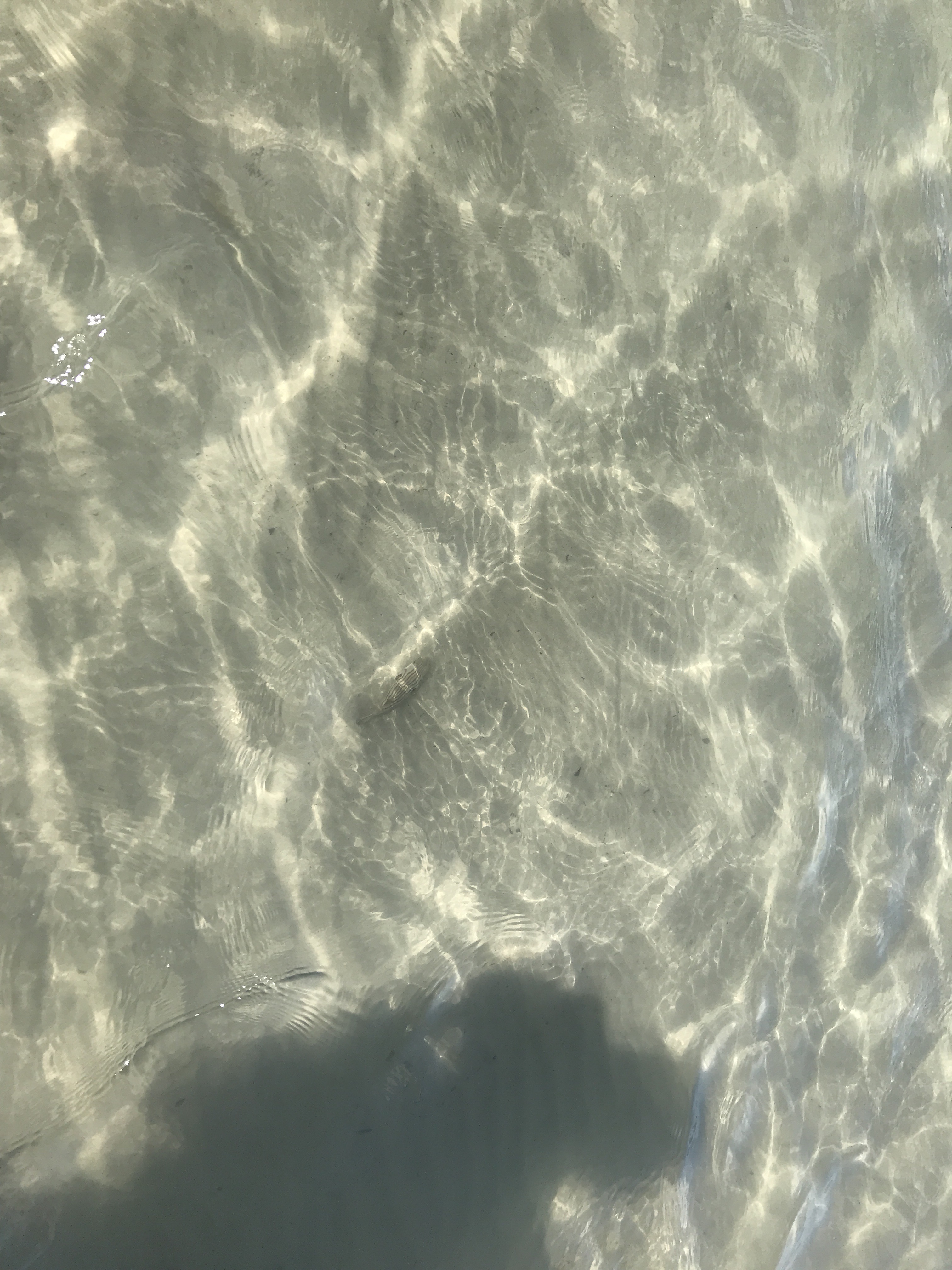 Walking through the sea lapping around our ankles, seeing fish , crabs, sea snails, with the level rising up to our waists, I almost trod on a Ray! A little further out and a with a helping hand the level dropped away again.