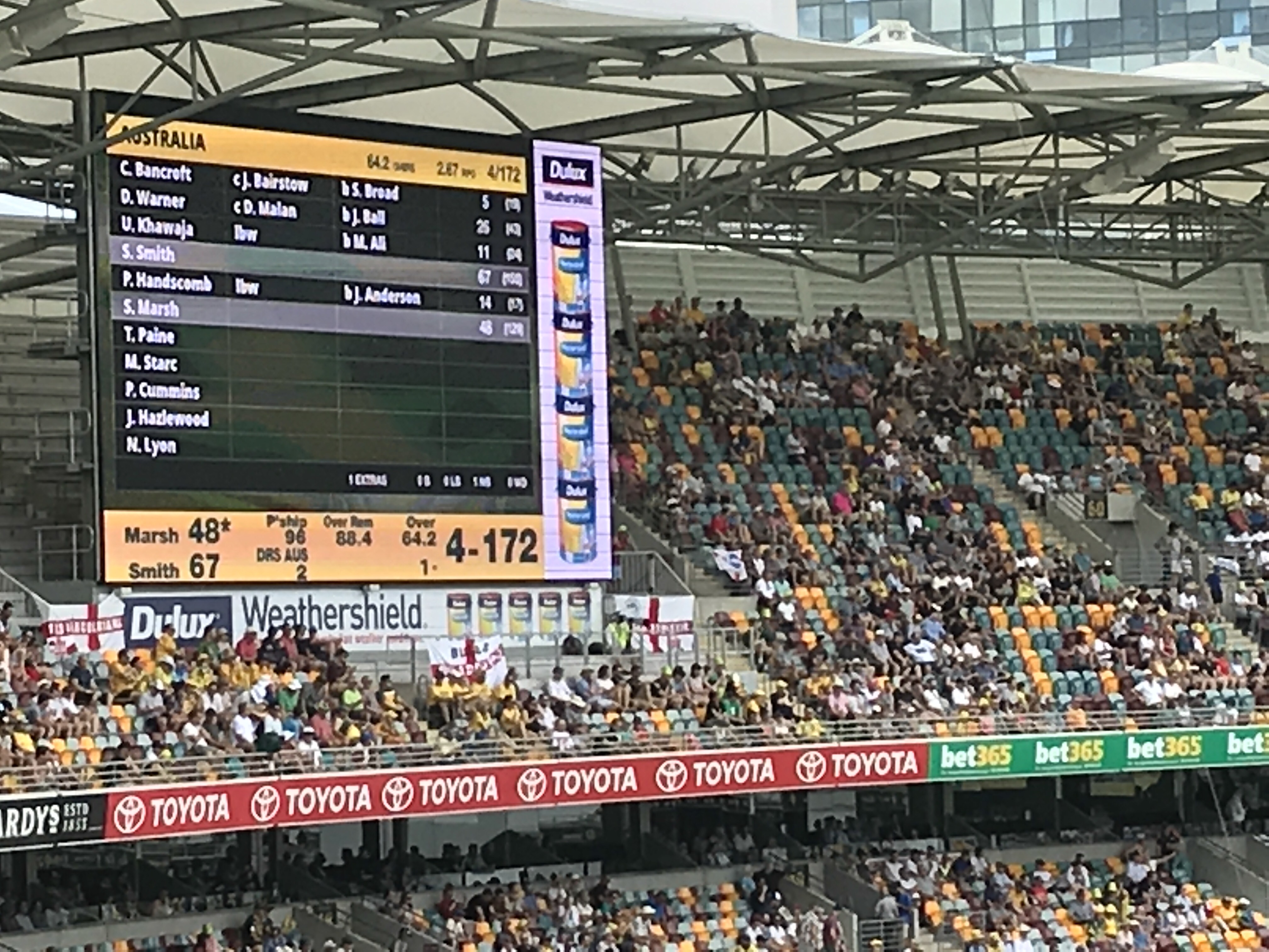 Cook and Stoneman came to the crease with hopes high. The atmosphere became very tense, with not only the field pressure, but the 30,000 Aussie fans, clapping and shouting for an England batsman to be out.