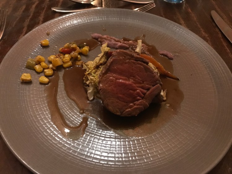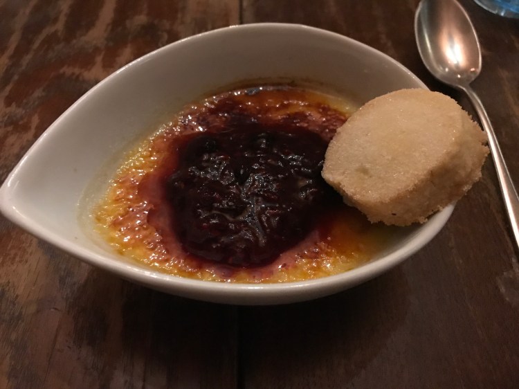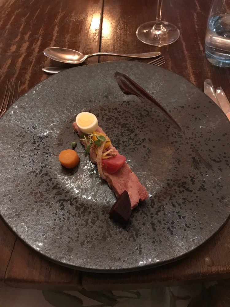 Ham hock terrine, scallop, fillet beef and creme brûlée.