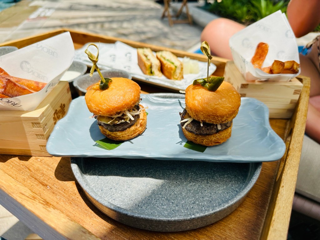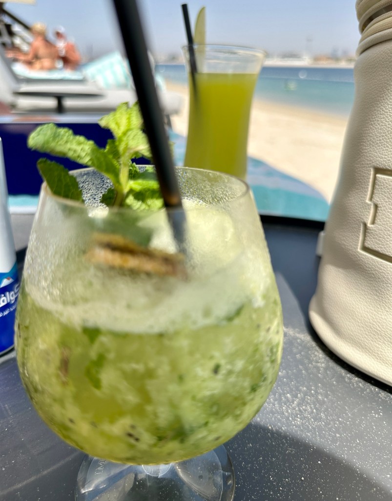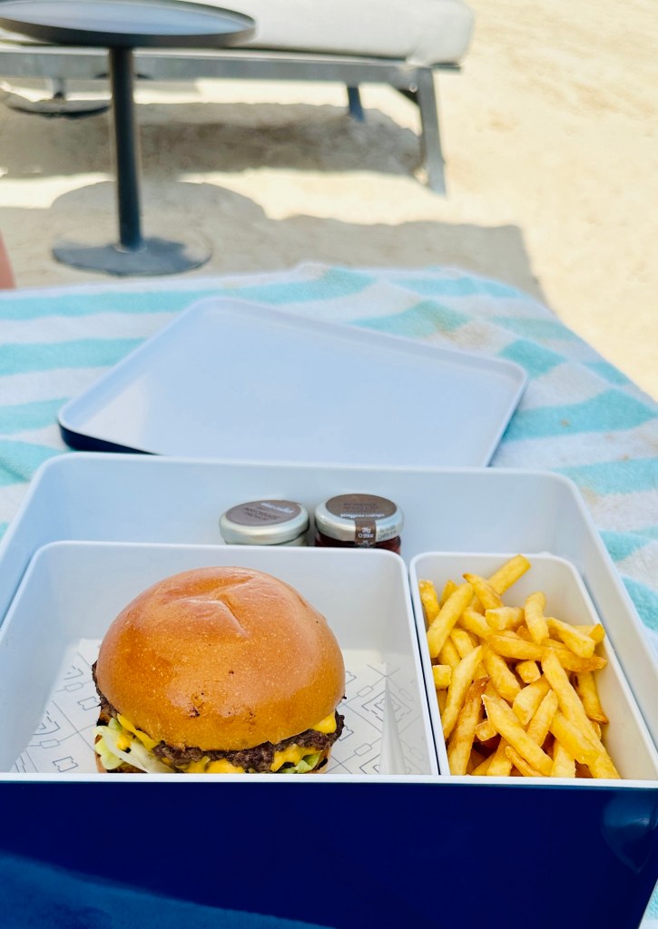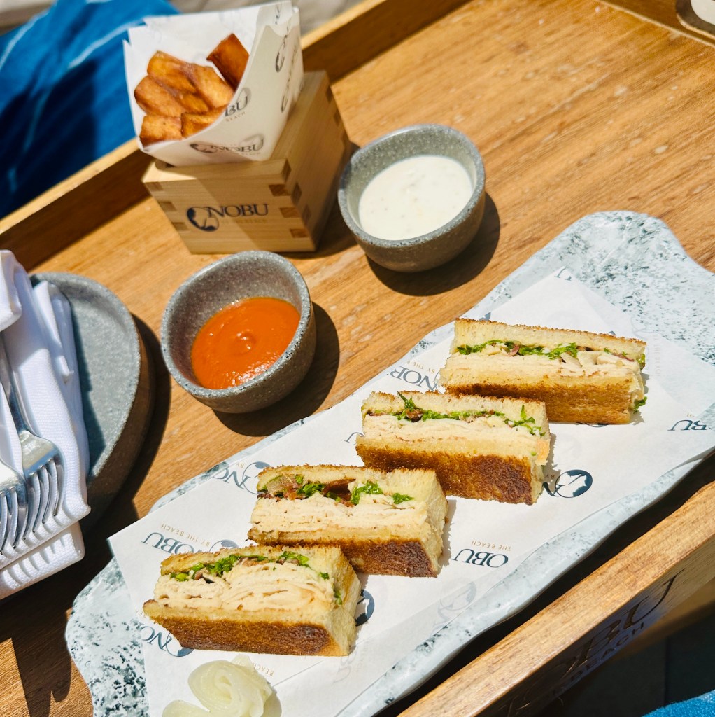 After a good night’s sleep we enjoyed breakfast and made our way to Nobu by the beach, pre booked. The staff prepare the loungers, and we were treated to various shots, ice lollies and cooling spray.