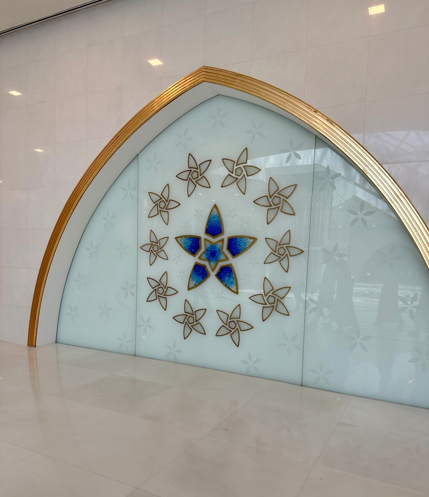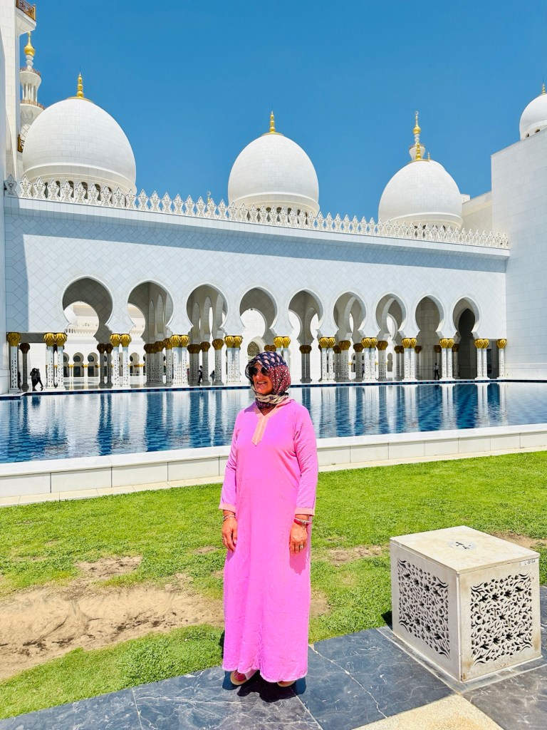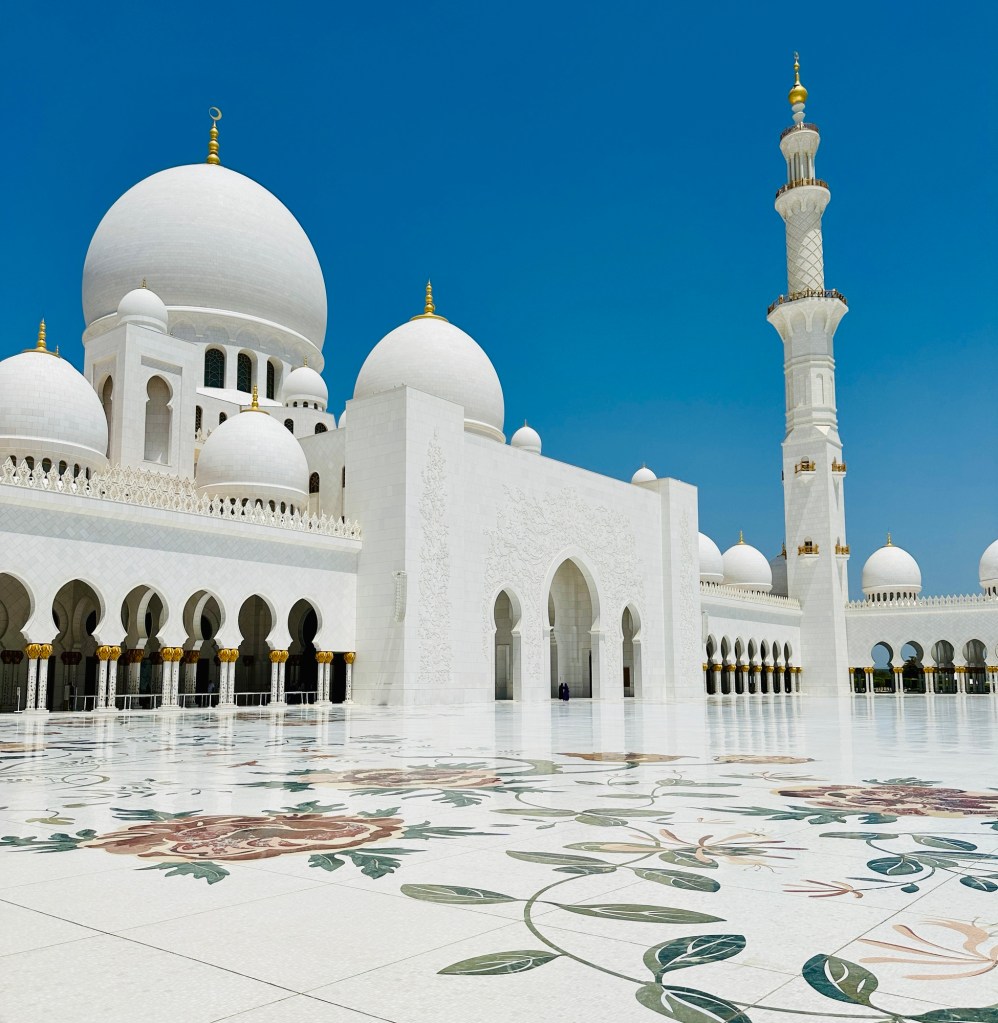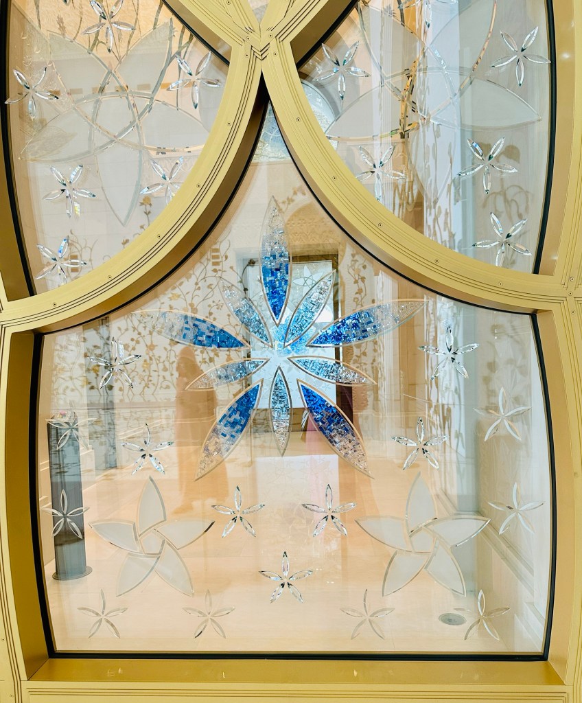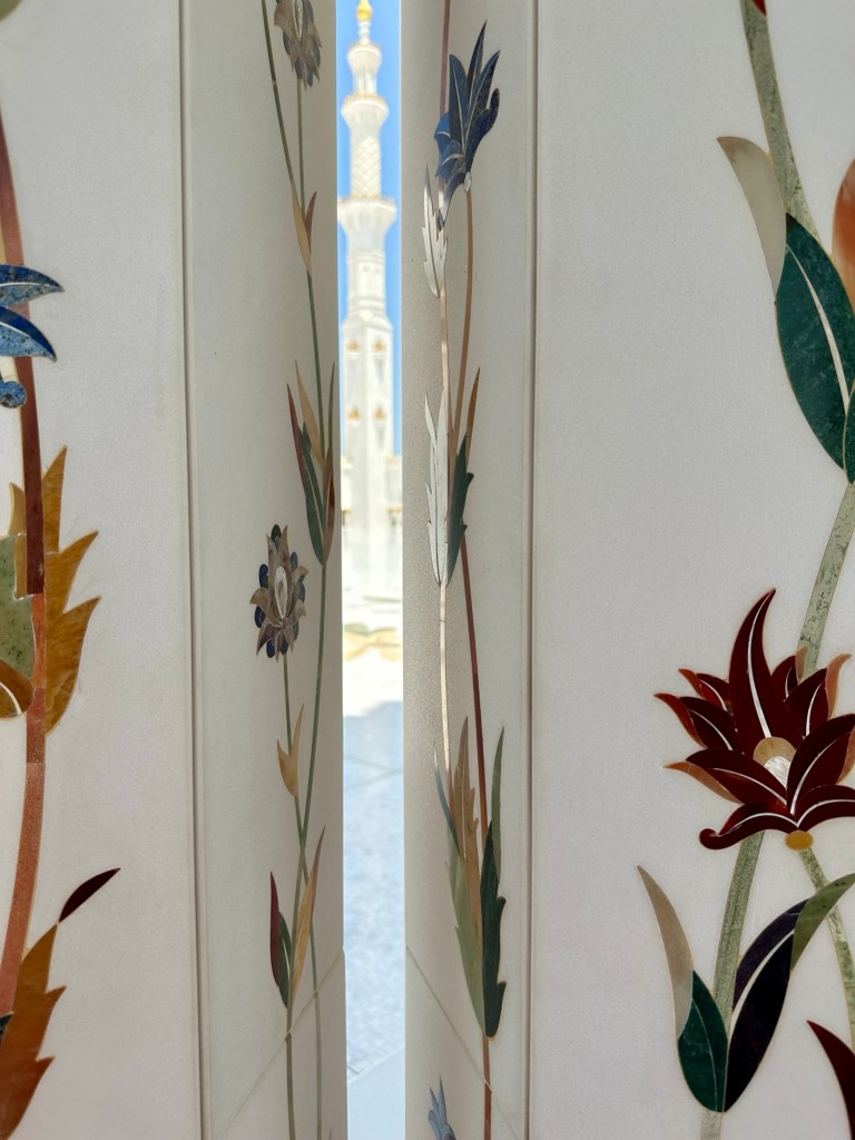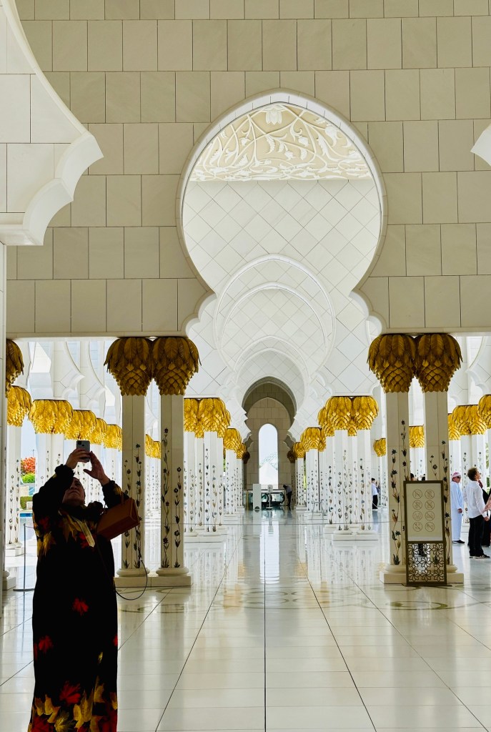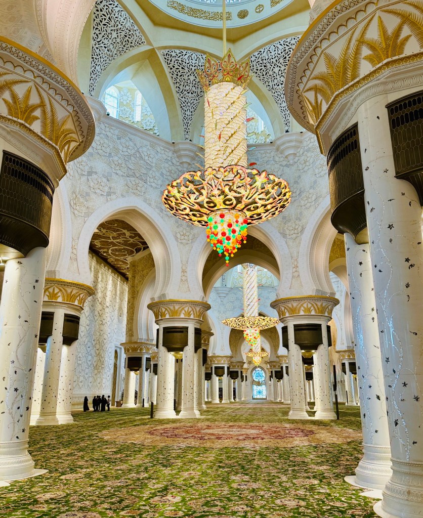 We booked a trip to the Grand Mosque in Abu Dhabi ( pronounced Abu Zabi) which was worthwhile visiting, and wearing an abaya obligatory in order to enter. The white marble is beautiful to see and touch. The chandeliers are a sight to behold. It felt peaceful although the incessant pouting and posing for photographs of visitors for the ‘gram’ did detract from the serenity of this building.