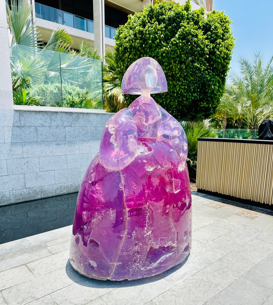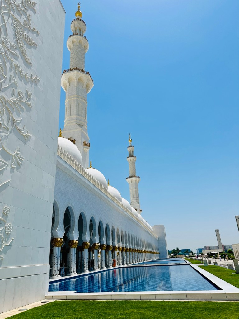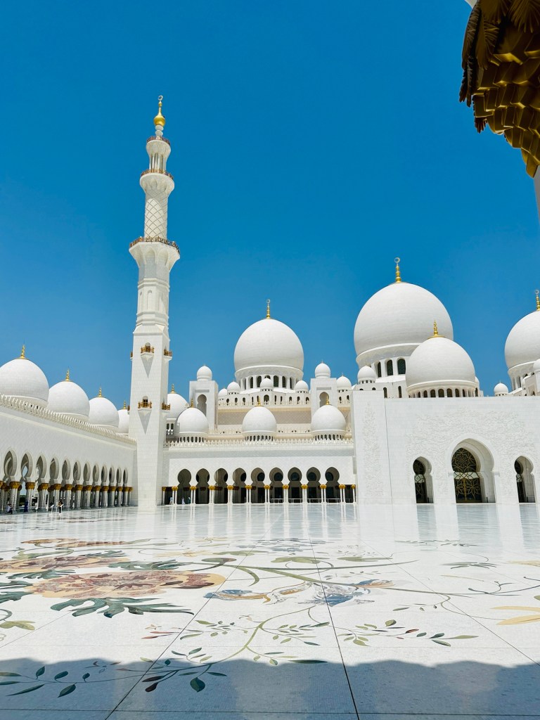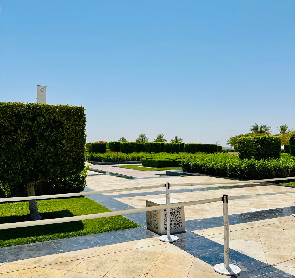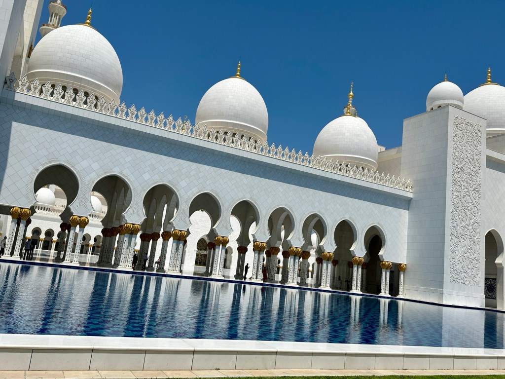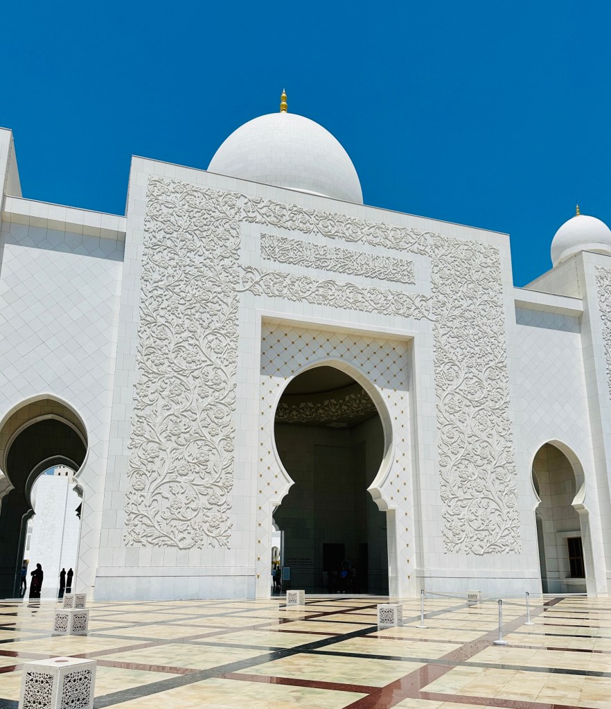 We booked a trip to the Grand Mosque in Abu Dhabi ( pronounced Abu Zabi) which was worthwhile visiting, and wearing an abaya obligatory in order to enter. The white marble is beautiful to see and touch. The chandeliers are a sight to behold. It felt peaceful although the incessant pouting and posing for photographs of visitors for the ‘gram’ did detract from the serenity of this building.